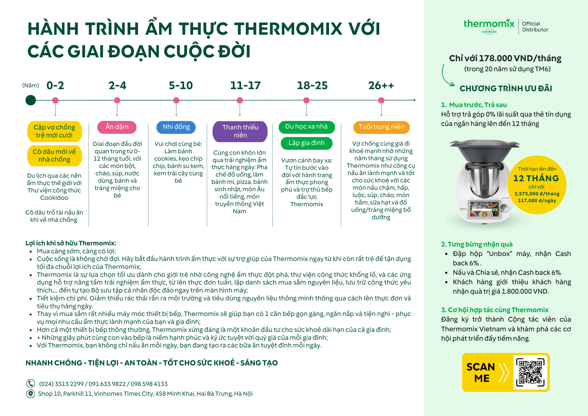 Từ năm 18 – năm 25: Đây là lúc con trẻ ở độ tuổi bước vào cuộc sống tự lập, đi học xa nhà và sau đó là lập gia đình riêng. Thermomix, giờ dù đã “già”, nhưng vẫn tiếp tục đồng hành cùng con, giúp con tự tin bước vào đời với hành trang ẩm thực phong phú cùng sự độc lập, tự tin biết lập kế hoạch trong cuộc sống.