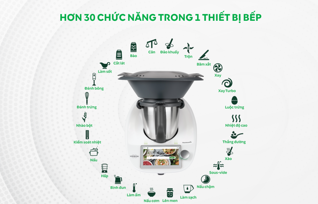 Thermomix TM6 đã tích hợp sẵn hệ thống Wi-fi và Bluetooth ngay trên thân máy. Khách hàng sở hữu TM7 vẫn được tận hưởng đặc quyền kết nối trực tiếp với kho công thức khổng lồ Cookidoo® và nhận ưu đãi 3 tháng trải nghiệm miễn phí tương tự.