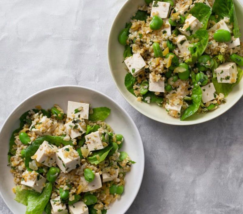 - Cách 2: Dùng đậu phụ non, rau diếp xoắn, rau cải non, rau cúc tần, dầu oliu, giấm táo, nước tương, mật ong, hành tây cắt nhỏ, mè trắng.